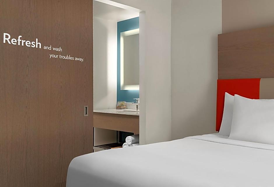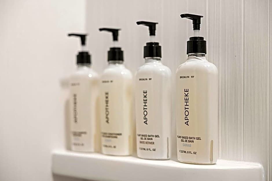 This room features eucalyptus linens, a work space, a 40-inch flat-screen TV, LED mood lights and a fitness space.